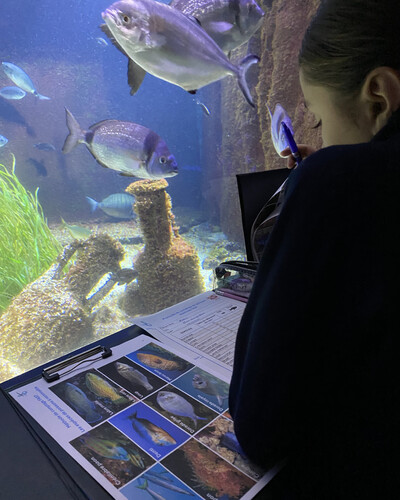 The students first received theoretical training on the topic, presenting the method and the criteria used to identify different fish species. They then headed to the Mediterranean section of the Oceanographic Museum of Monaco's aquariums to put their new knowledge into practice. Equipped with identification slates, they were tasked with recording the species present and estimating their size.