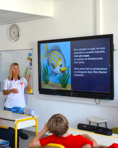 Les élèves ont découvert la mascotte de l’année, une petite saupe rencontrée dans l’AME par les plongeurs de l’AMPN. Inquiète de constater l’augmentation régulière de la température de l’eau, elle a demandé de l’aide pour tenter de freiner ce phénomène.